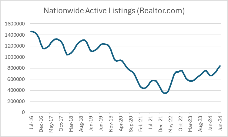 Inventory keeps rising. For the week ended June 29, the nationwide inventory of homes for sale was up 38% year-over-year, with new listings rising 11% YoY.