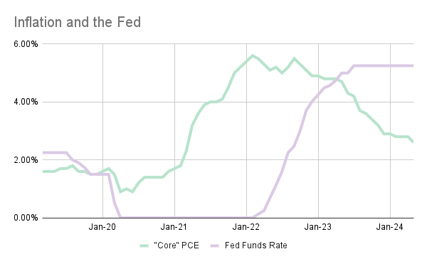- “Core” PCE (the Fed’s favorite inflation gauge) peaked at 5.6% in February 2022, and had dropped to 2.6% by May 2024.