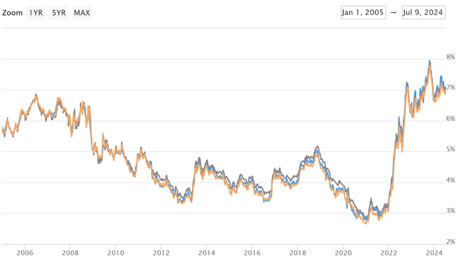 - The Fed started hiking rates in March 2022, and only stopped tightening in July 2023, having lifted short-term interest rates by 525 basis points or 5.25%.